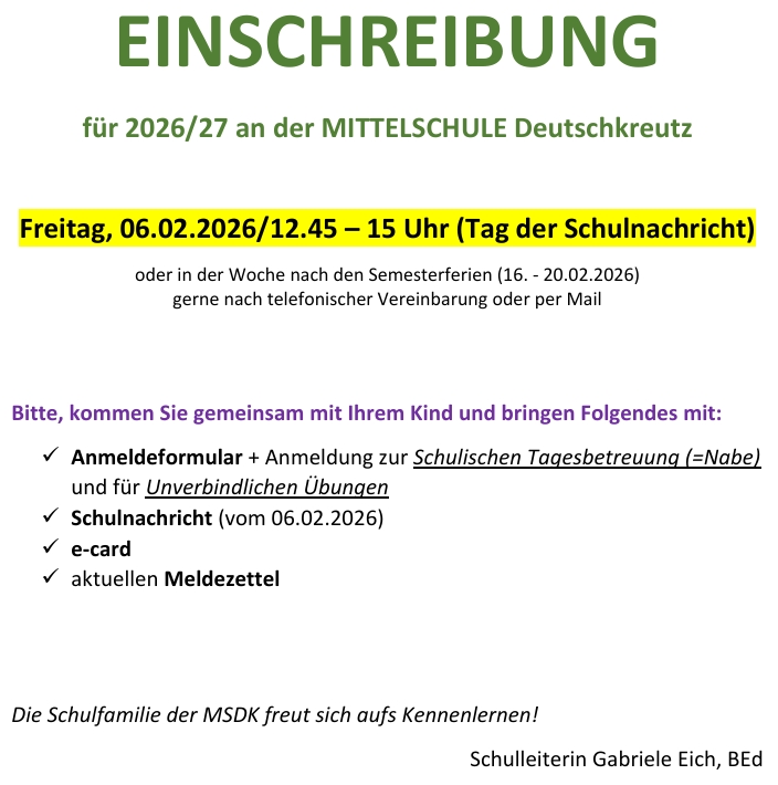 - Informationen zur Einschreibung für das Schuljahr 2026/27 an der Mittelschule Deutschkreutz